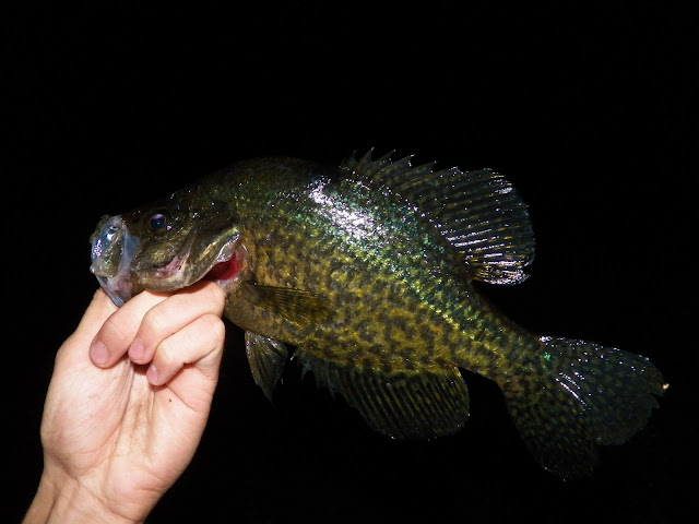 Tonight was rather interesting. I spent a while catching absolutely nothing. Then, when it got completely dark, the spillway of the dam I was fishing became a hive of activity as panfish began gorging on whatever was there to gorge on. For whatever reason the bluegills in this pond are abnormally aggressive. When I spin fished regularly I often caught them on big top-water plugs, so it was no surprise to catch them on a big mouse. The surprise I did get was a crappie! Every once in a while I've had them come up on foam spiders or poppers, but I was not expecting one on a mouse. It was big enough to undo my knot (it's easier to make mistakes in the dark) but fortunately he landed on the ground and I got both fish and fly back. That about sums it up. Tomorrow is going to be a big day for the mice, I'm planning on covering some mileage and fishing a few different rivers.