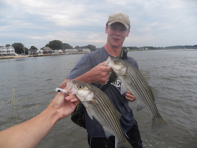 I changed from the bucktail to a popper and told Dalton to put on a spook. I was into schoolies immediately. They were blowing up on that fly almost every cast. It was not long at all before I was hooking fish. Dalton was having a harder time getting them on, but eventually he was catching fish too. His old braided line became a problem though, and he ended up donating quite a bit of tackle. If the action hadn't been so incredible he would have been upset. But that's the thing. The bite was so incredibly on that there was no time to be upset. And it was only getting better!